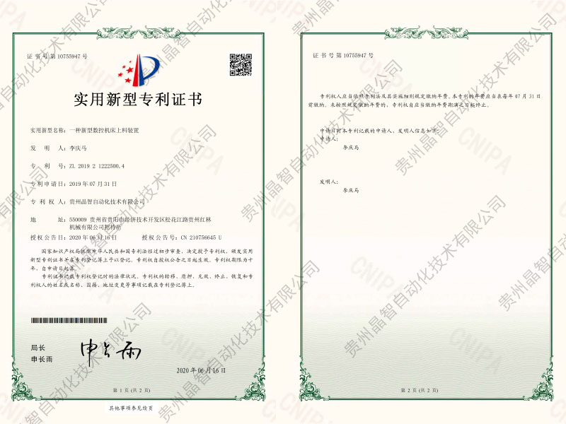 一种新型数控机床上料装置专利证书
